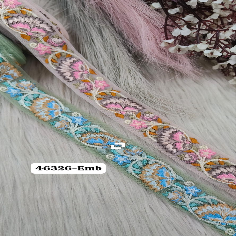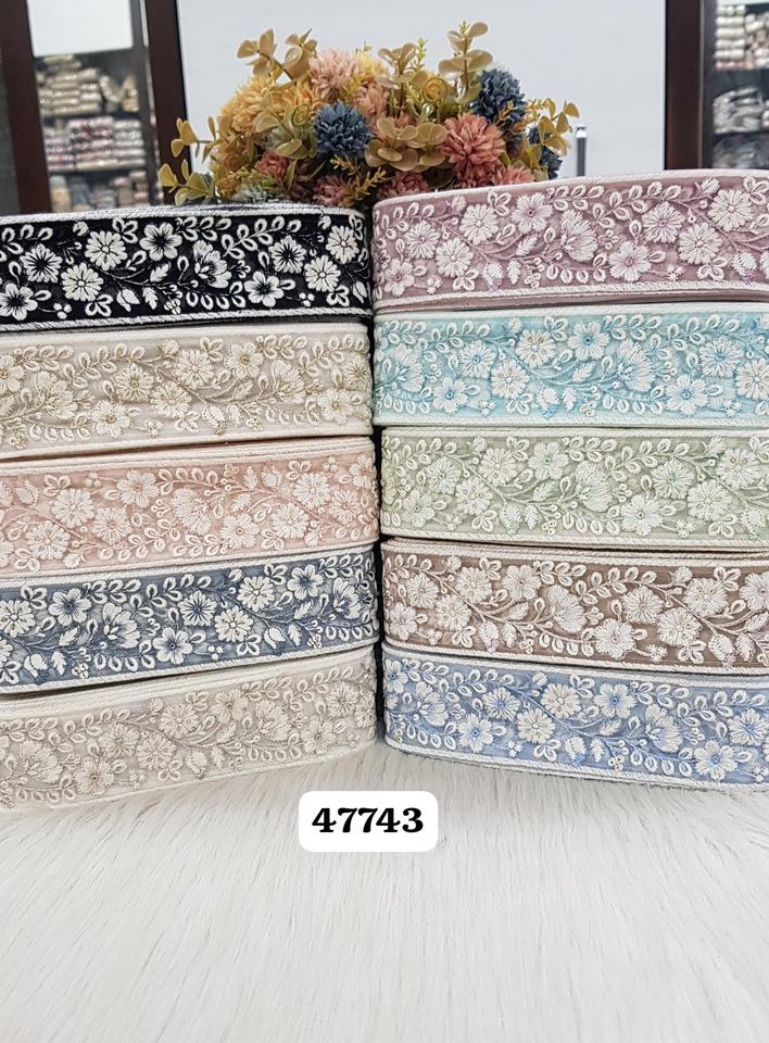 Custom made on net base fabric embroidered floral designed laces in 1 inch width in 2 colours for garment beautification.