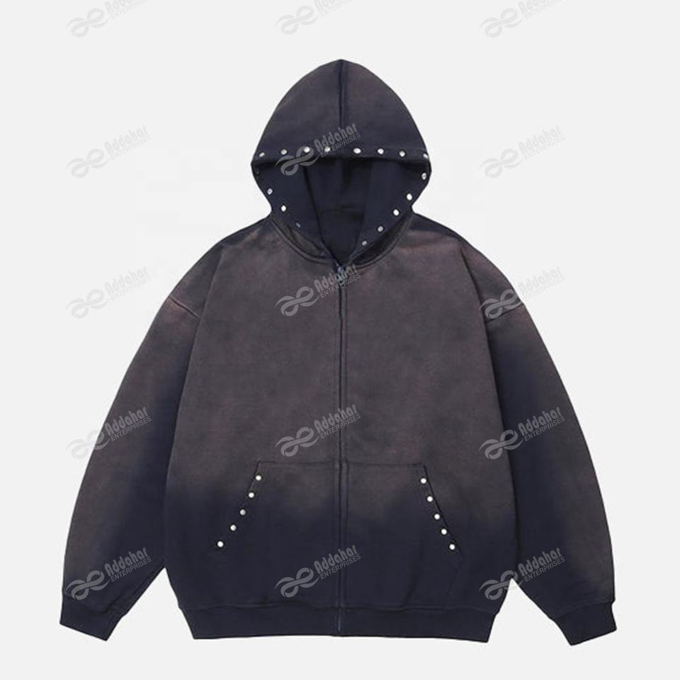 Custom Manufacturer Sun Faded Embroidery Zipper French Terry Street Wear Acid Wash Men Zip up Heavyweight Rhinestone Hoodie