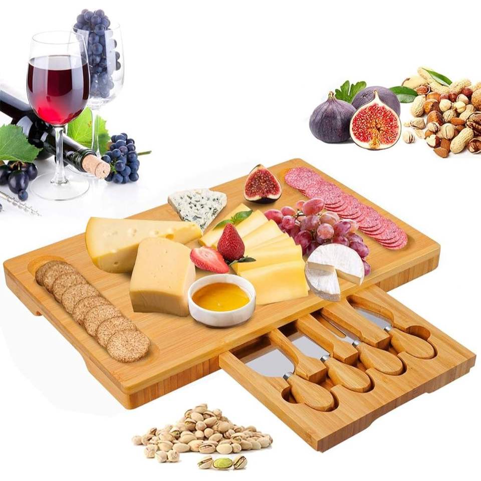 Customise Acacia Wooden Eco-Friendly Round Cheese Knife Set and Cutting Board with 4-Piece Holder-Kitchenware