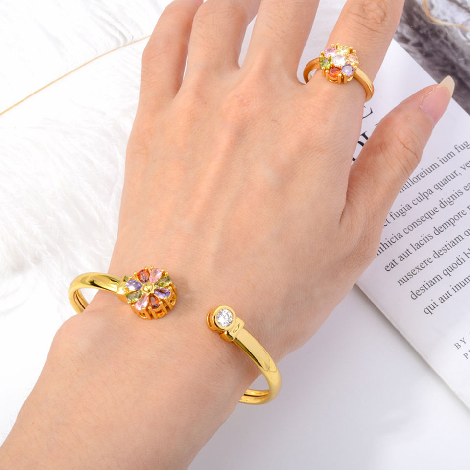 Customised 14K Gold Plated Brass Charm Flower Bangles CZ Indian Tube Sparkle Fancy Bracelet Ring Set