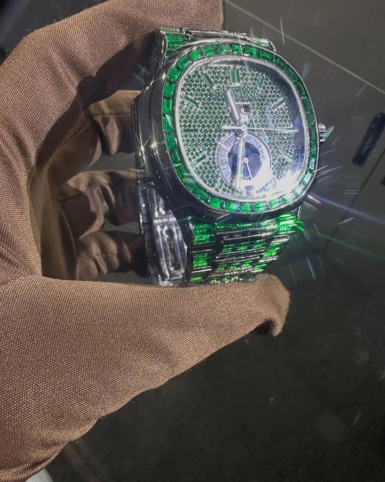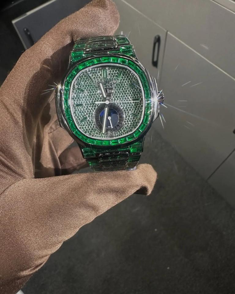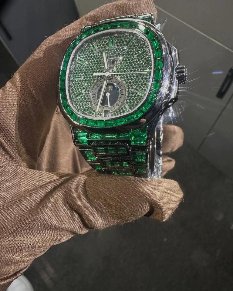Customised Logo Green Diamond Full Iced Out Wrist Watch with Baguette Cut Premium Luxury Antique Hiphop Jewelry From India