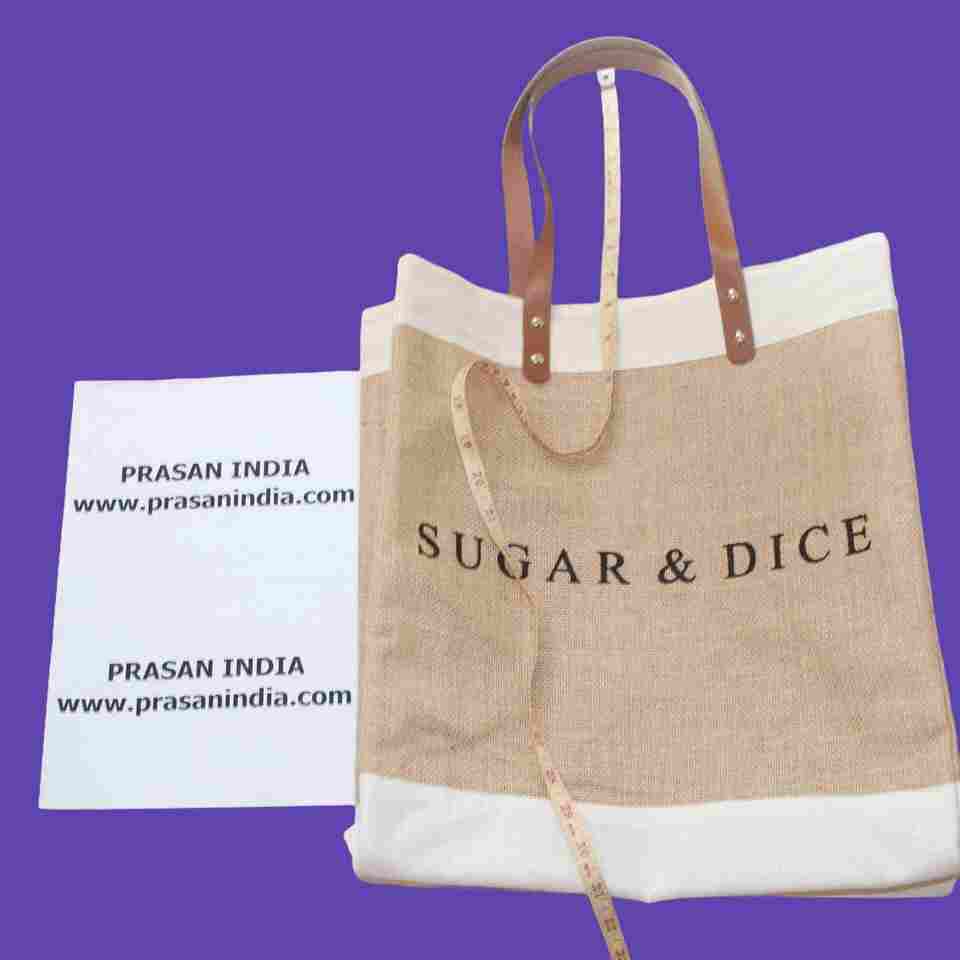 Customised Logo Pure Leather Strap Jute Tote Handbags Fully Bespoke Shopping Bags