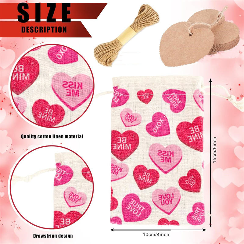 Customizable 10*15cm Burlap Pink Heart Drawstring Gift Bags Recyclable Linen Pouches Cotton Rope for Jewelry Jute-Valentine's