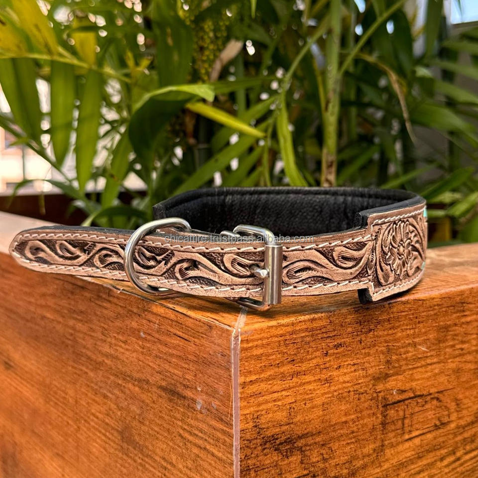 Customizable High Quality Genuine Leather Padded Dog Collars Adjustable Luxury Design Hand Tooled Leather Heavy Duty Pet Collar