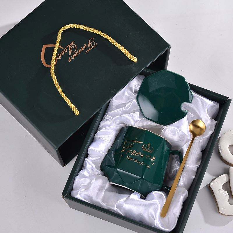 Customizable Items Diamond Shape, Ceramic Couples Cup With Lid Spoon Porcelain Mugs Gift Sets for Women Gift Items/