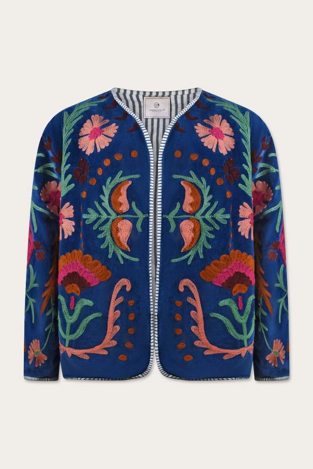 Stand-up collar,straight fit,satin fabric,fully embroidered