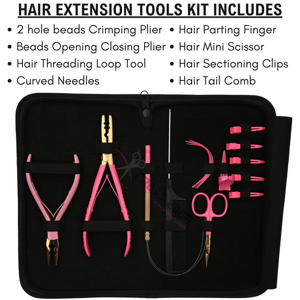 Customizable Pink Hair Extension tools Set featuring Pink 2 Hole Crimping Plier Beads Remover Tool Curved Needles Duckbill Clips