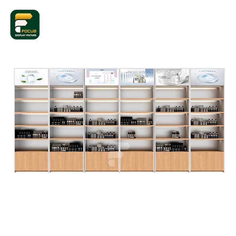 Customizable White and Wood Display Shelves Spacious Storage Beauty and Cosmetics Showcase