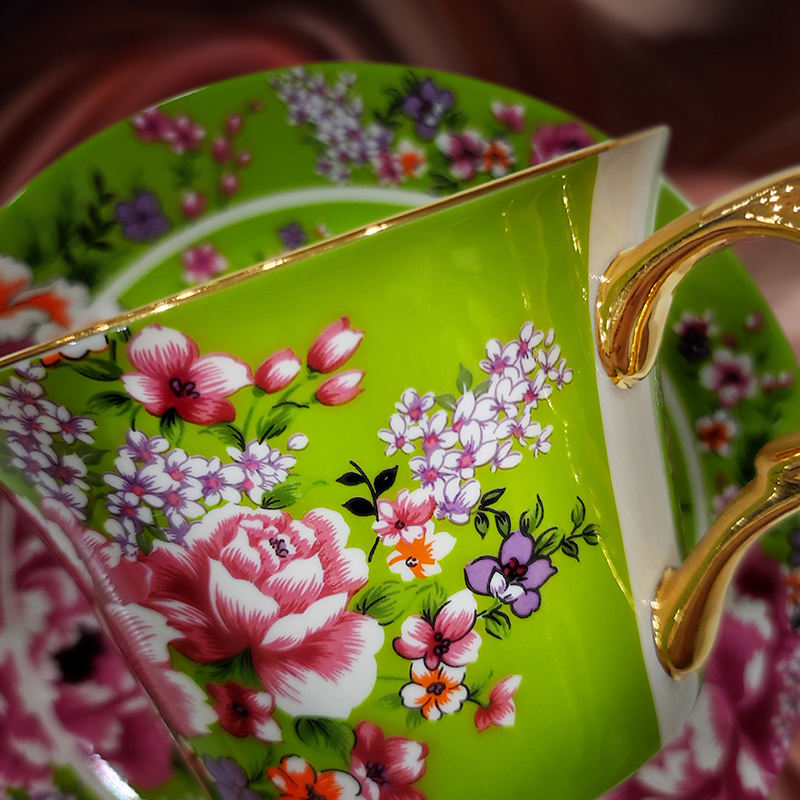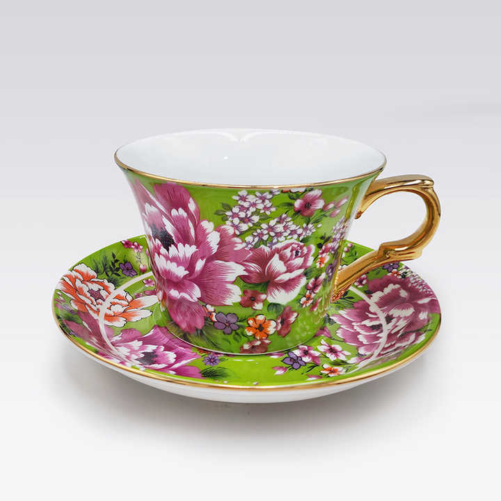 Customizable Daily Life Green Ceramic Teacup Gold Handle Washable Practical Screen Printing Transfer Onglaze Decal Peony Mug