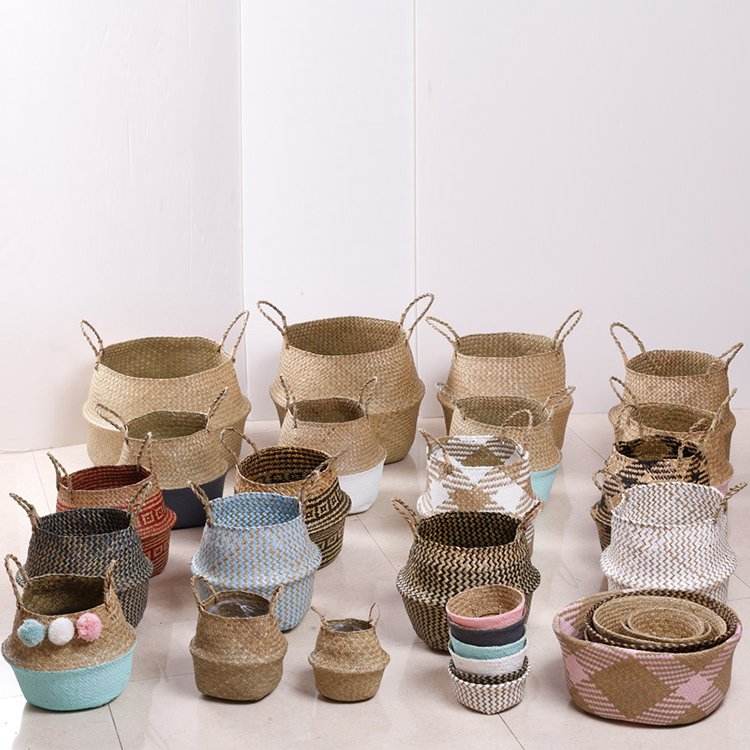 Customizable Sizes Mini Seagrass Belly Basket Hand Weave Braided Sea Grass Straw Raffia Baskets Foldable