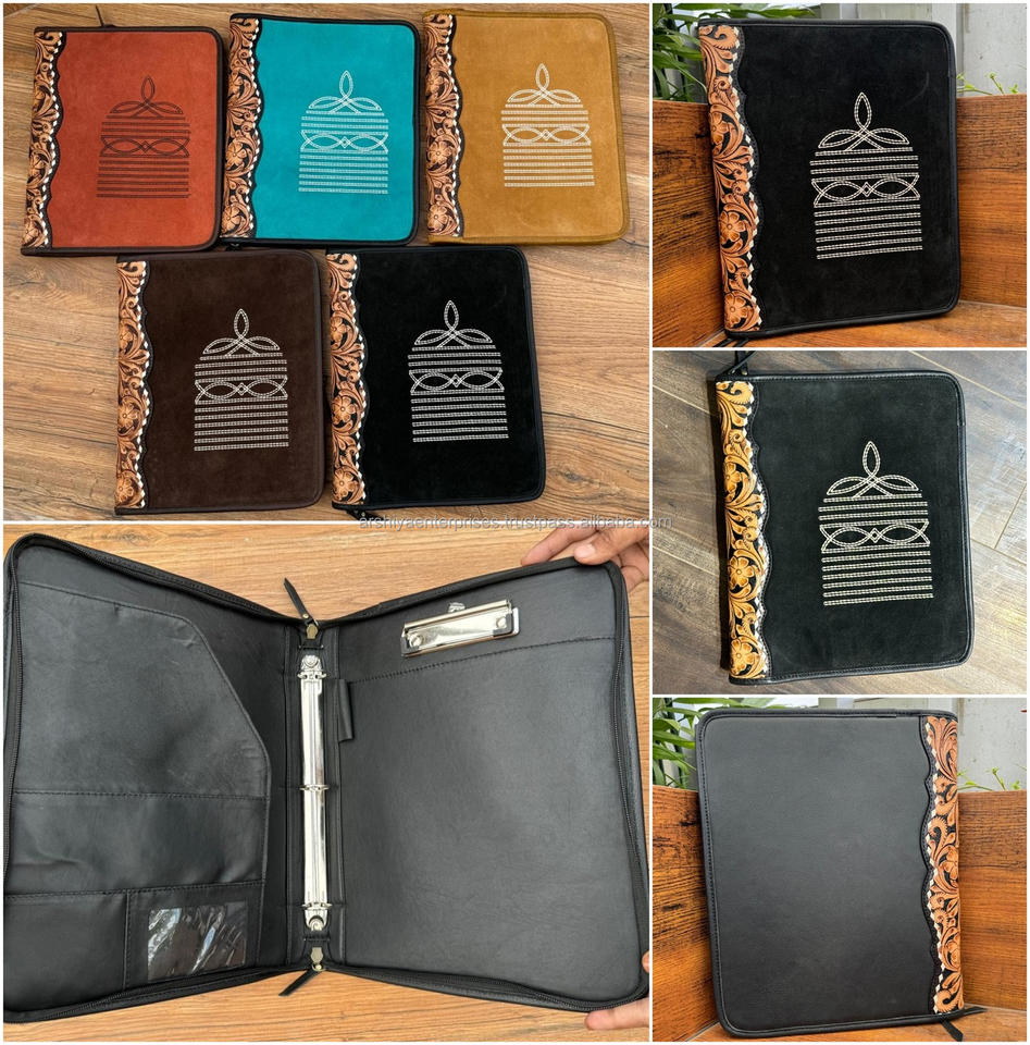 Customize A4 Boot Stitch Hand Tooled Suede Leather Business Portfolio Folder Document Case Organizer Zipper File Padfolio Folder