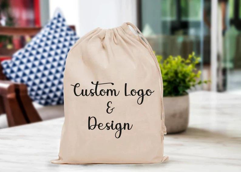 Customize Logo Printed Cotton Jute Drawstring Bags. 100% Organic Cotton Reusable Storage Bags Cotton Produce Bag Jewelry Gift