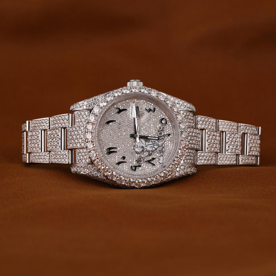 Customize Luxurious Men's Moissanite Watch with Iced out Arabic Numerals Glass Dial Window Hip Hop Rapper Style
