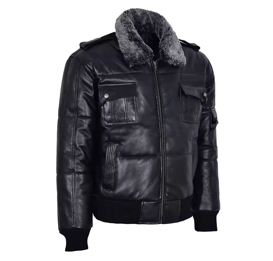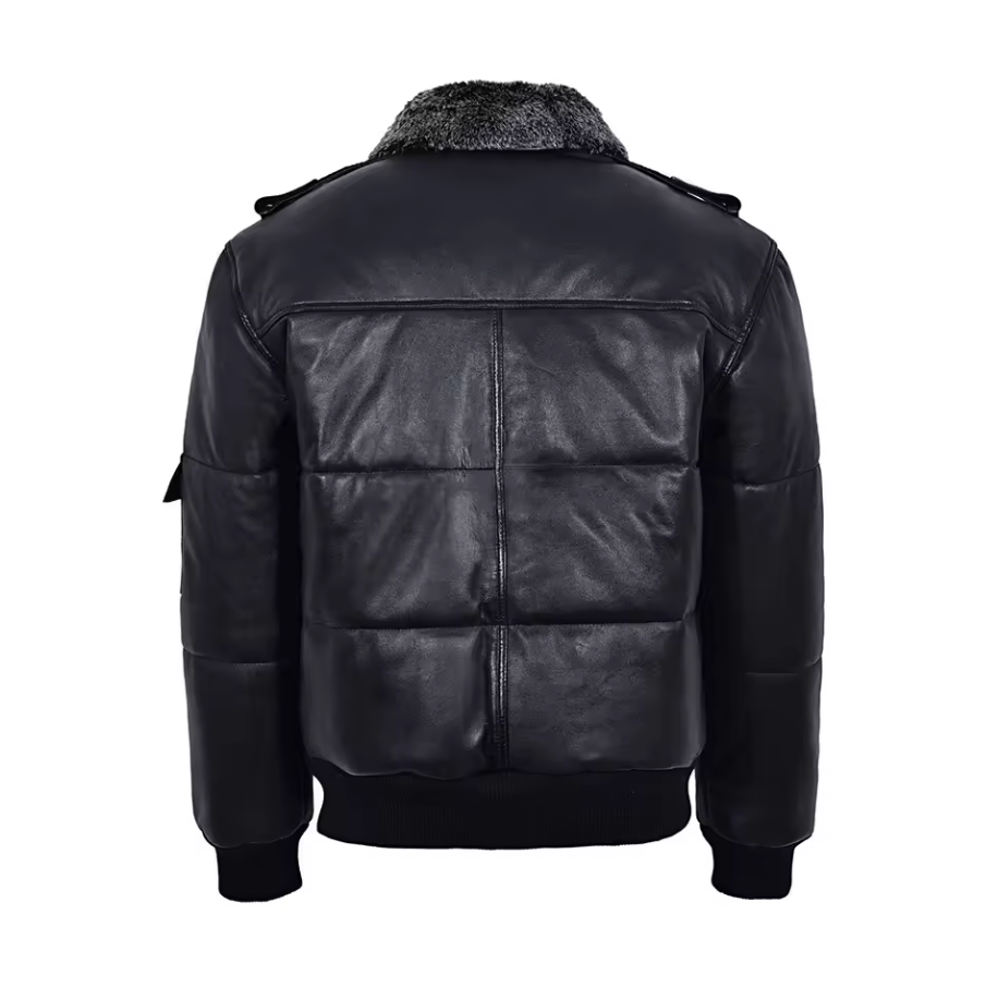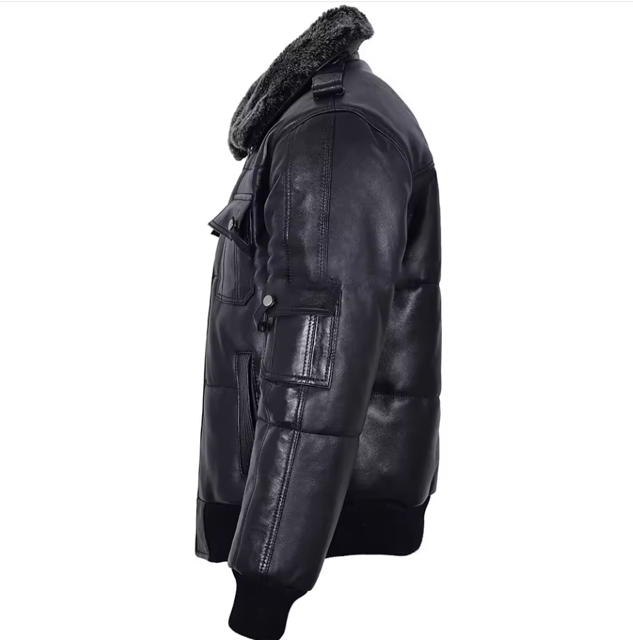 Customize Men's Leather Puffer Jacket Bomber Leather Jacket Style in Real Sheepskin Black Puffer Leather Jacket