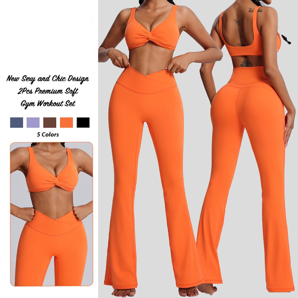 Customize logo New Design Sexy bra Activewear Sets for Women, 2 PCS Unique Knotted Front Sports Bra with Gym Flared Yoga Pants
