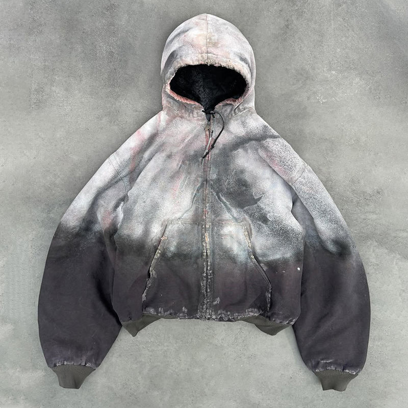 Customized Acid Washed Hoodie Applique Embroidery Vintage Techwear Puffer Quilted Cotton Padded Bomber Hoodie Men Winter