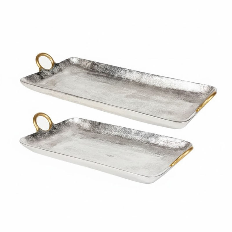 Customized Aluminum Serving Tray Silver Polished for Home and Hotel Tabletop Food And Drinks Serving Trays With Gold Handle