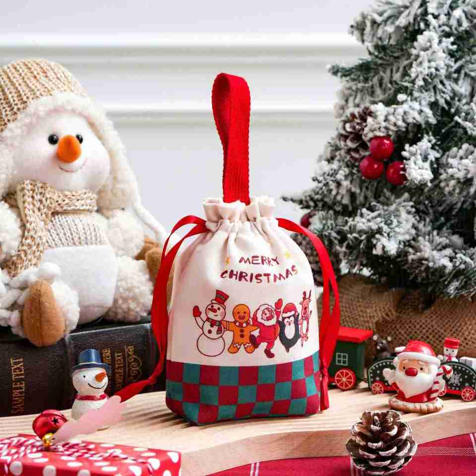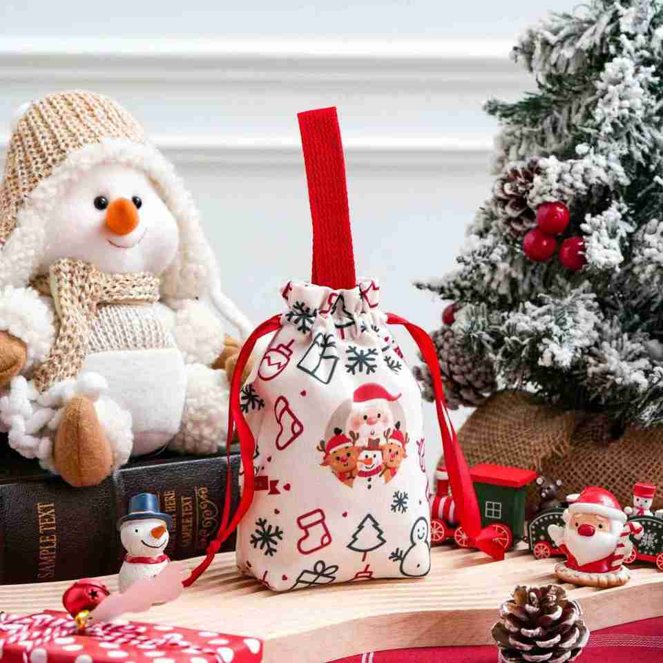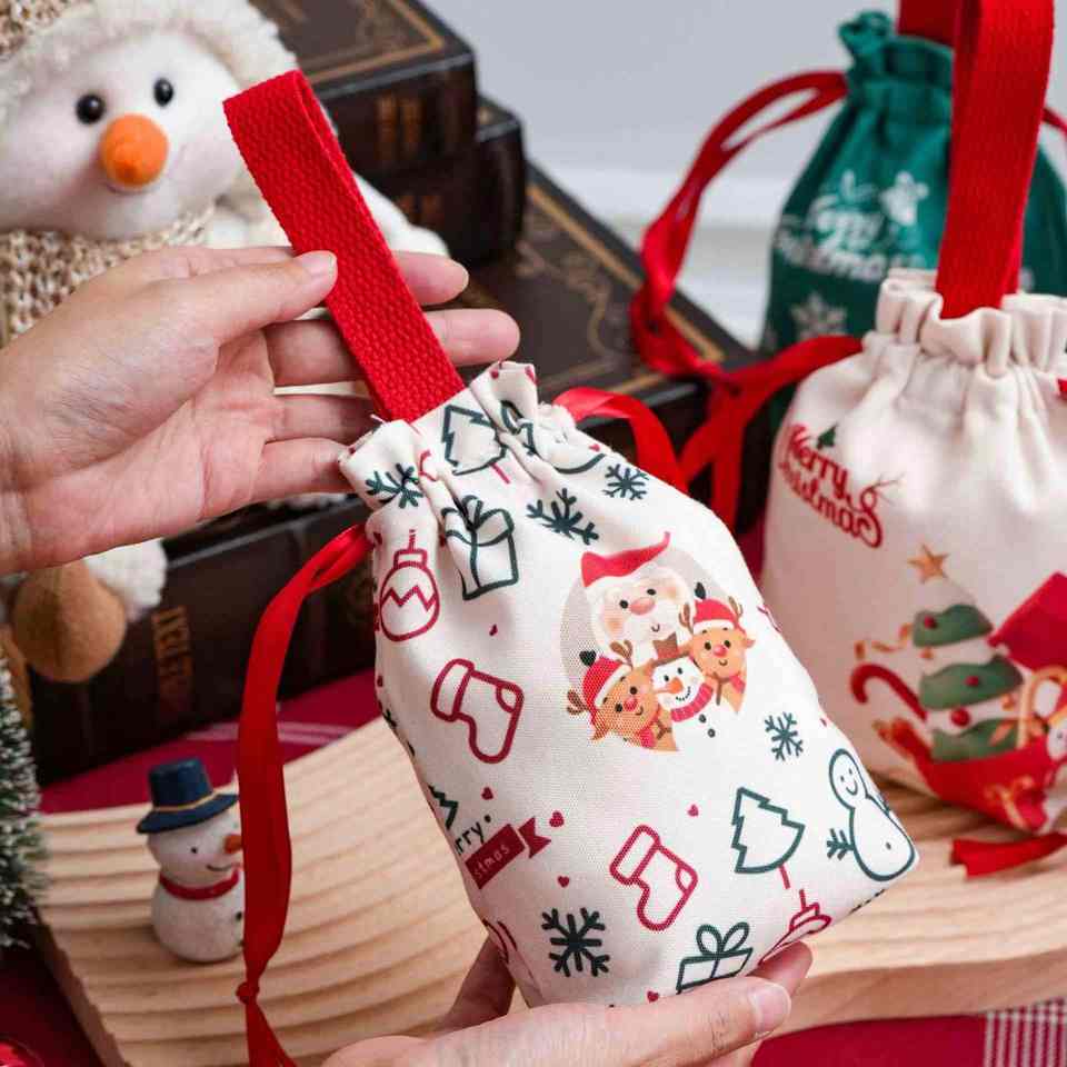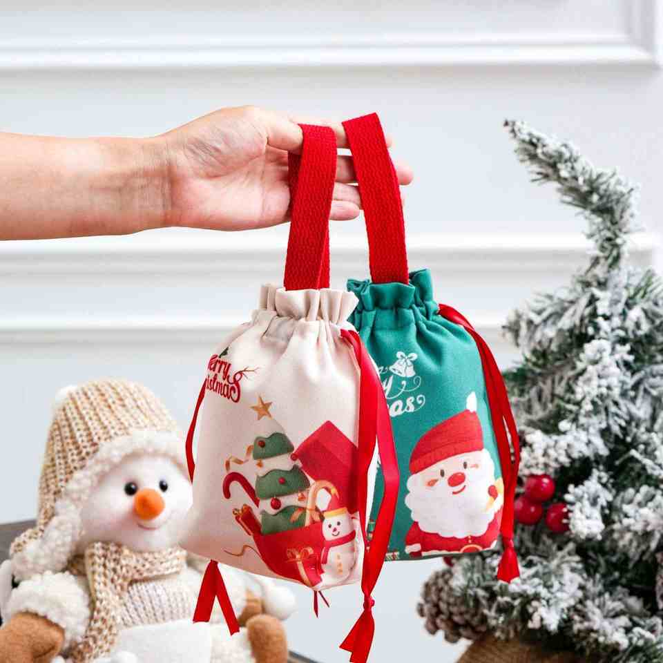 Customized Christmas Canvas Drawstring Storage Bags Handheld Feature for Festival Decoration Business Gift Packaging Featuring