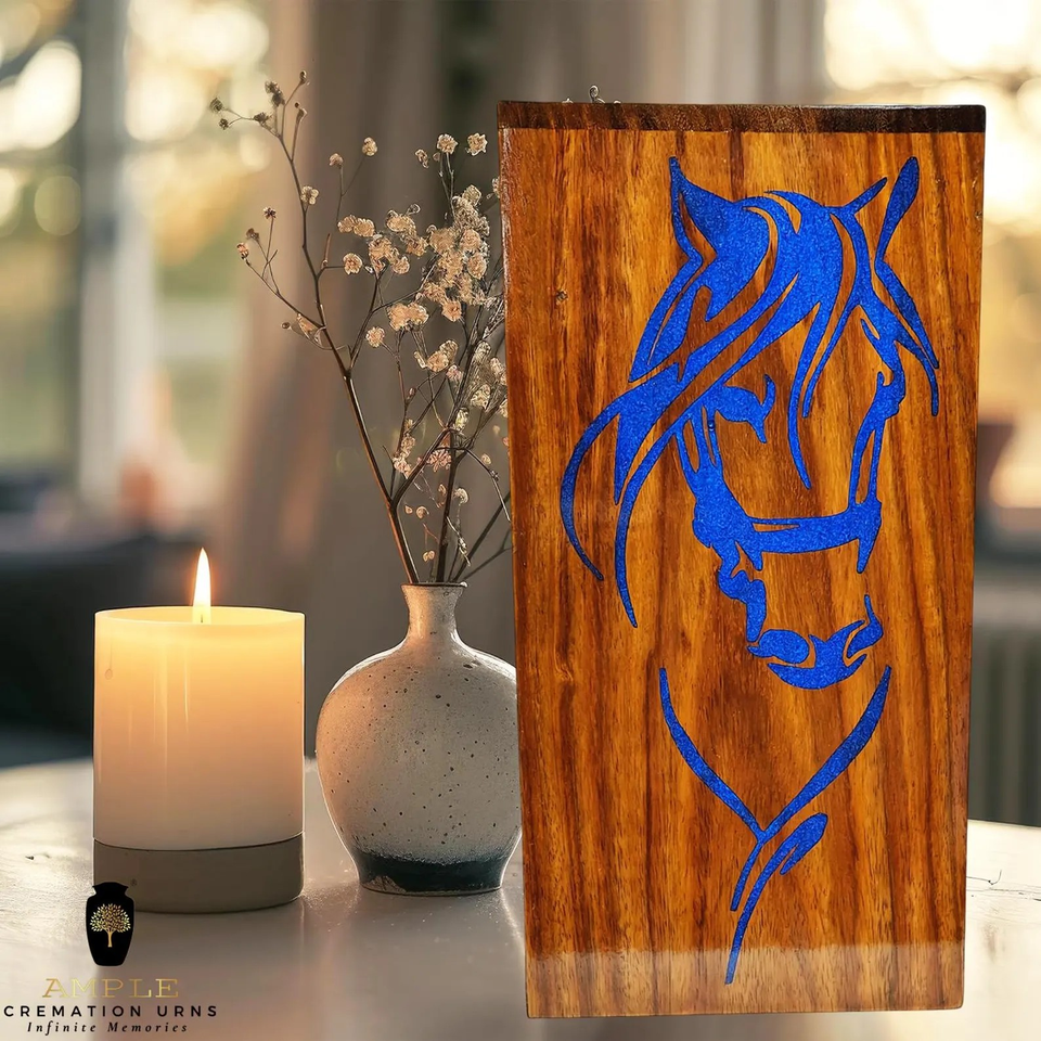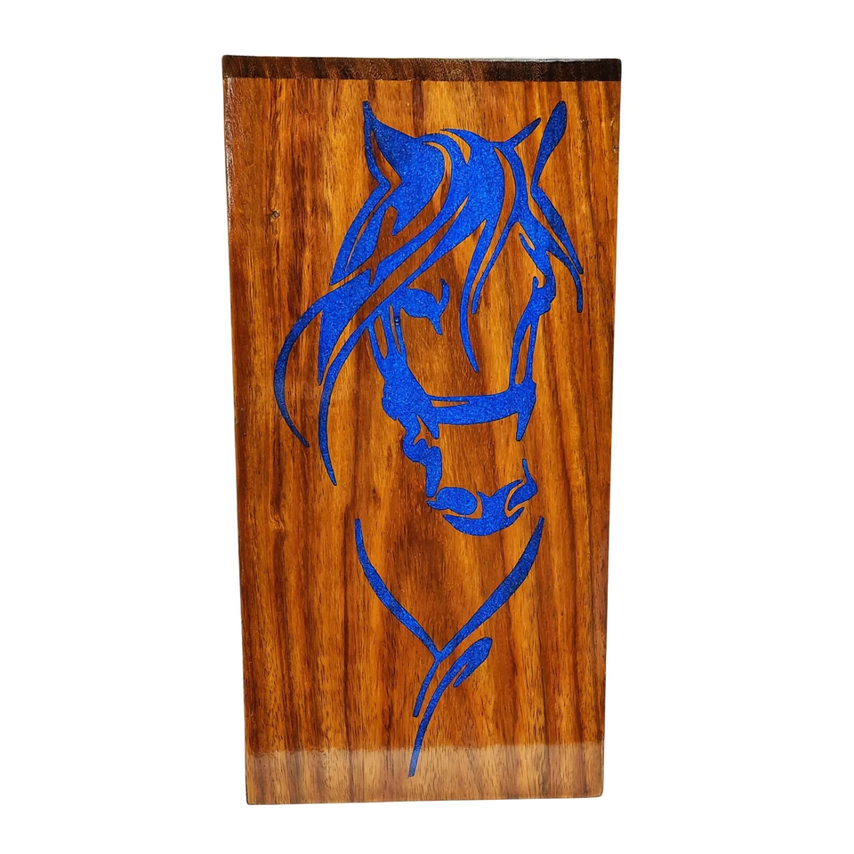 Customized Cremation Urns Horse Memorial Wooden Urn with Blue Inlay Art Handmade Equine Cremation Box for Ashes or Keepsake