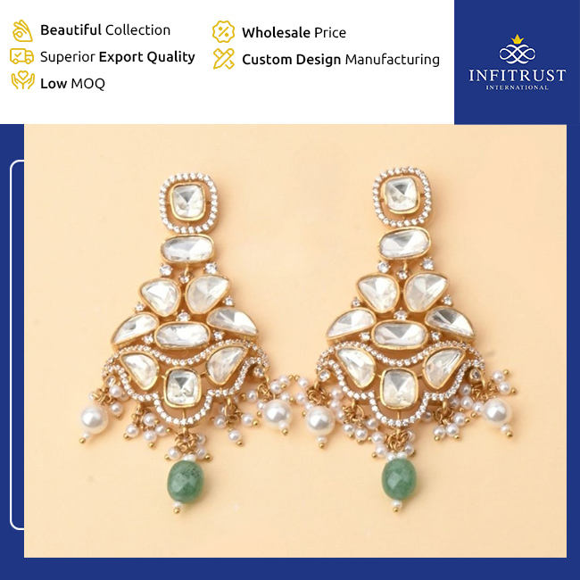 Customized Design White Stone Studded Embellished Pearl Beads Dangling Earrings for Women at Discounted Price from Indian Seller