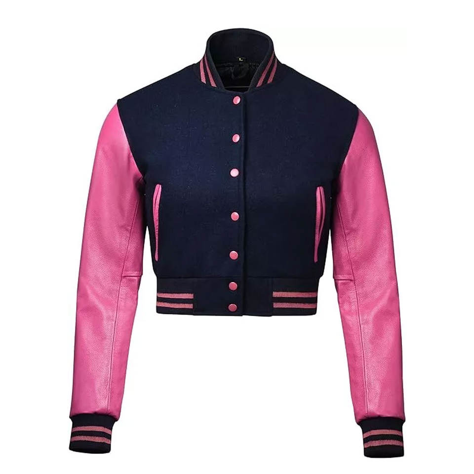 Customized Design Women Wool Leather Sleeves Cropped Baseball Jacket Long Sleeve Banded Collar Button Down Letterman Bomber Coat
