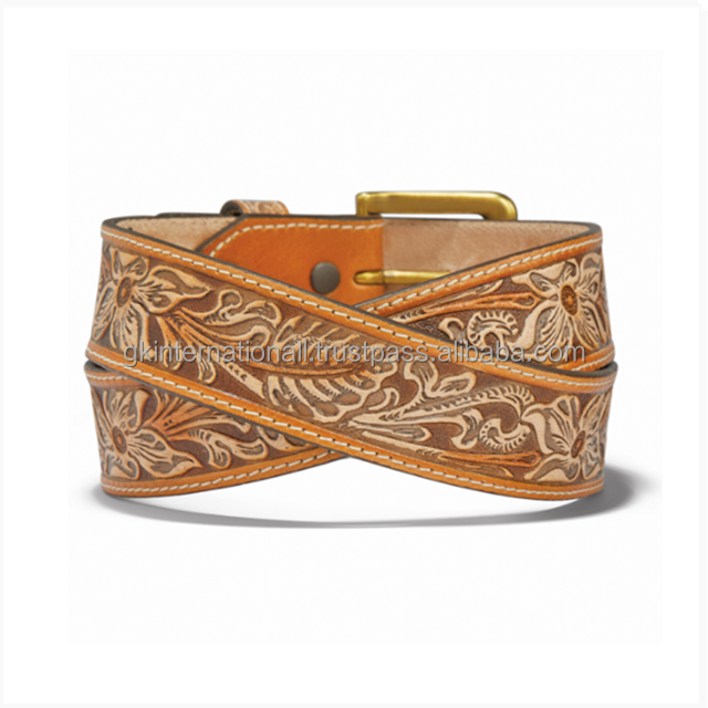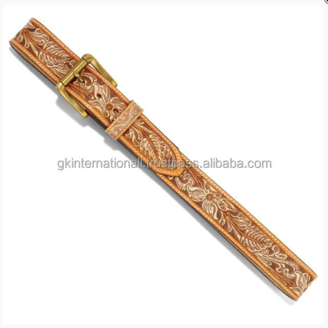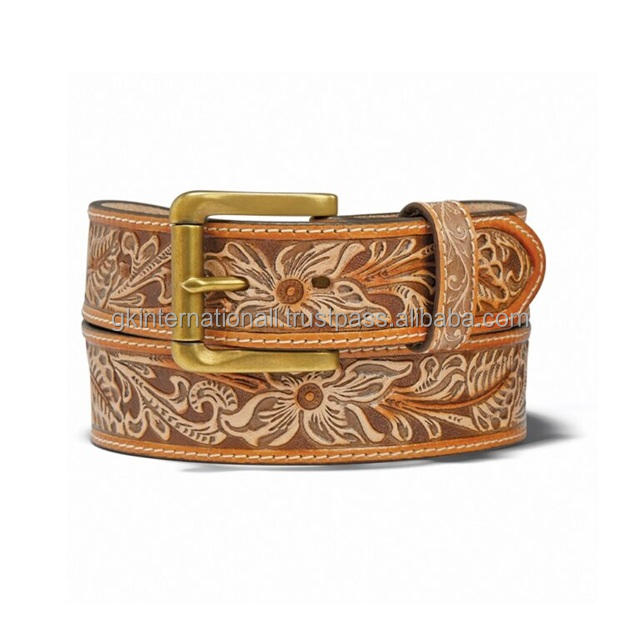 Customized Floral engraved Tan Premium western leather tooling belt with antique brass roller pin buckle tooled belt