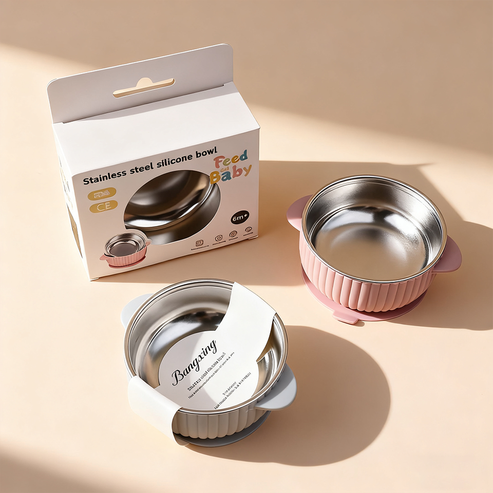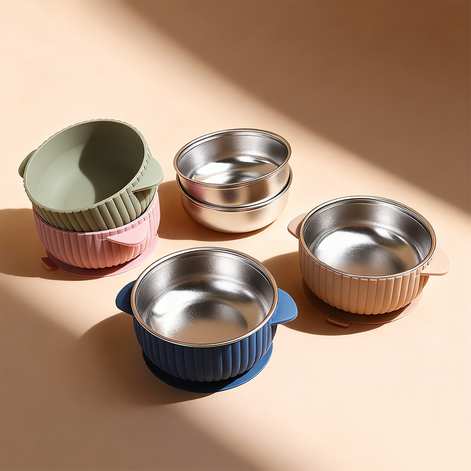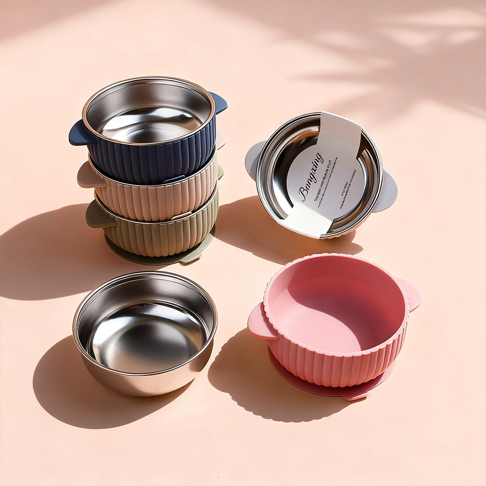 Customized Food Grade Platinum Silicone Sleeve Durable Unbreakable Kids Stainless Steel Baby Strong Suction Cup Bowl Set