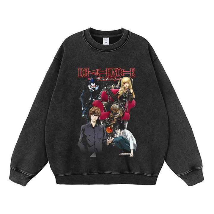 Customized Heavy Black 300Grams 100% Cotton Acid Wash Graphic Death Note Kira L Dragoned Ball Z Anime Men Long Sleeve Shirt
