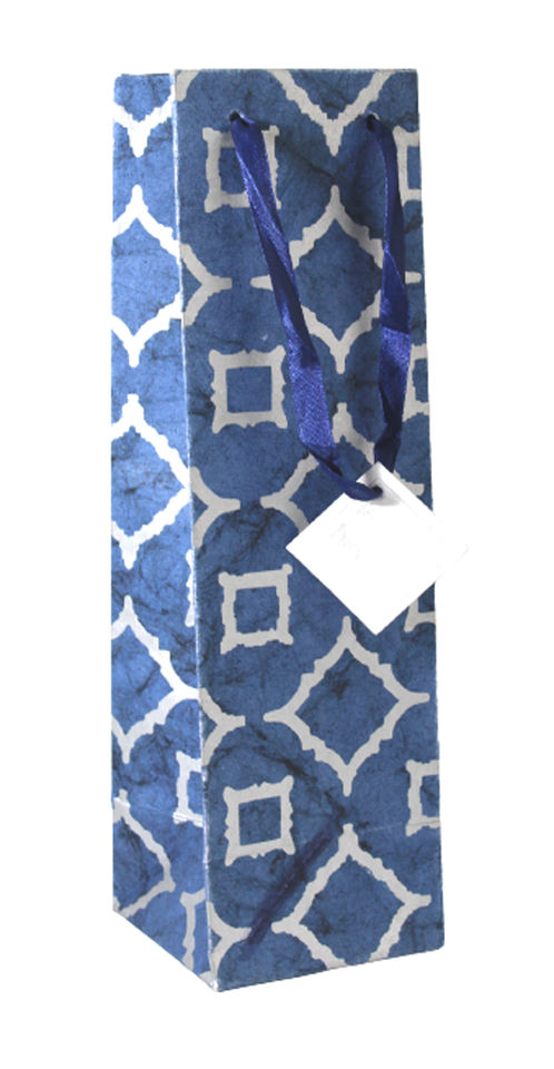Customized High Quality Eco Friendly Blue Art Paper Batik Handmade Metallic Silver Print Ribbon Handle Gift Bag for Photo Frame