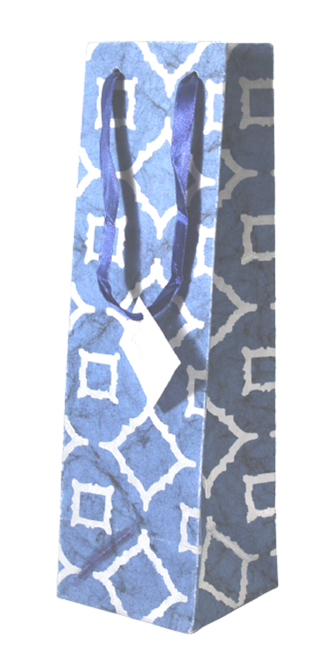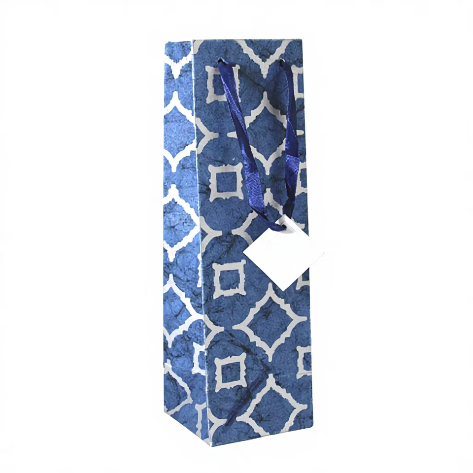 Customized High Quality Gift Paper Bag Eco Friendly Blue Color Batik Paper Handmade Metallic Silver Print Ribbon Handle