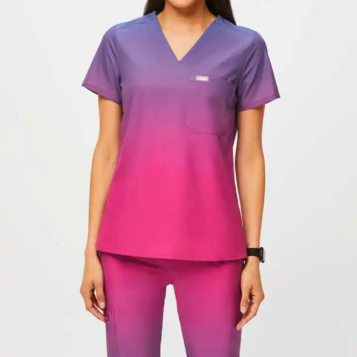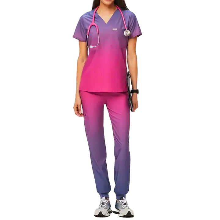 Customized Women's Hospital Uniforms Gradient Color Nursing Scrubs Suit with Sublimation Joggers & Accessories