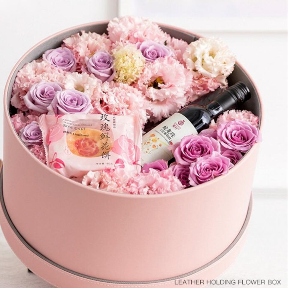 Customized Leather Display Box Round-shaped Paper Hug Bucket Wedding Bouquet Flower Package Chocolate and Jewelry Gift Box