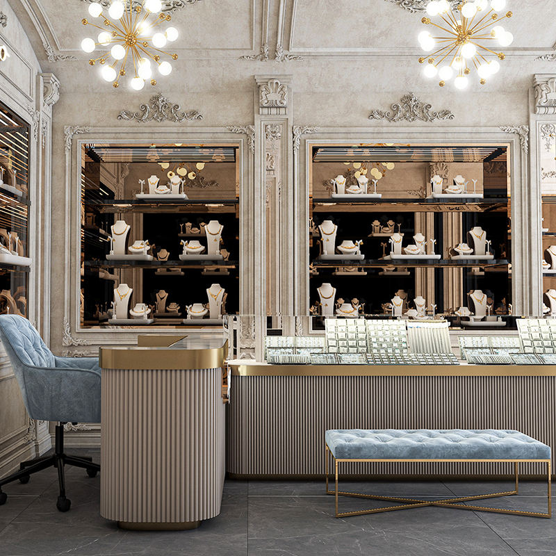 Customized Led Lighting White Gold Jewelry Shop Display Cabinet Modern Jewelry Showcase Display Cabinet for Shopping Mall
