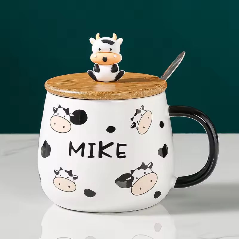 Customized Logo High-Capacity Reusable Cartoon Cute Cow Design Ceramic Coffee Mug Lid Spoon Dishwasher Microwave Safe