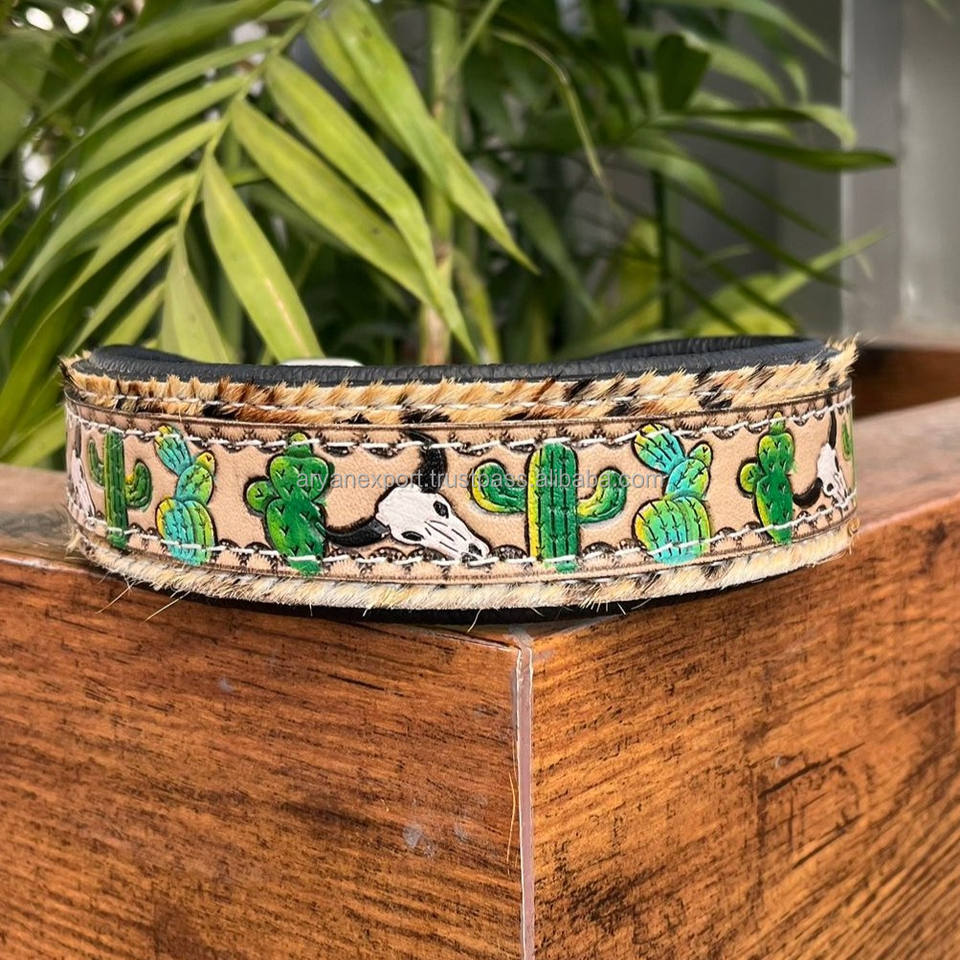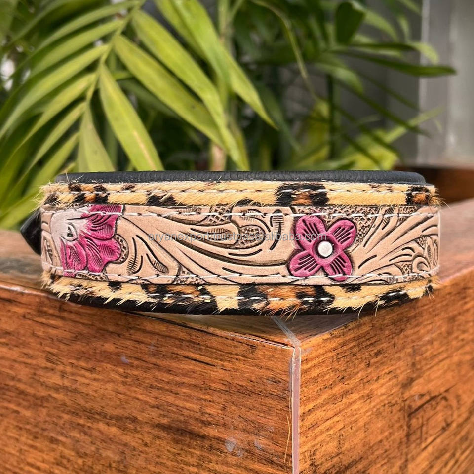 Customized Luxury Design Leopard Print Hand Tooled Leather Dog Collars Genuine Hair-on-Hide Adjustable Pet Collars for Dog Cat