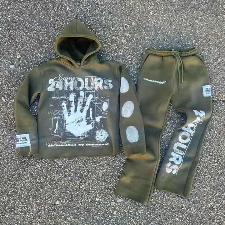 Customized Manufacturer Streetwear Screen Print With Sun Fade Pullover Hoodie and Sweat Pants Sweat Suit 100%Cotton 450GSM Flees