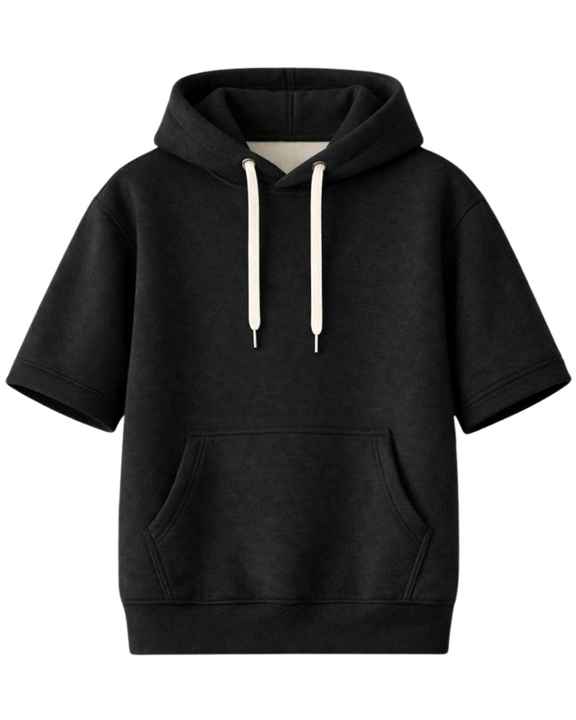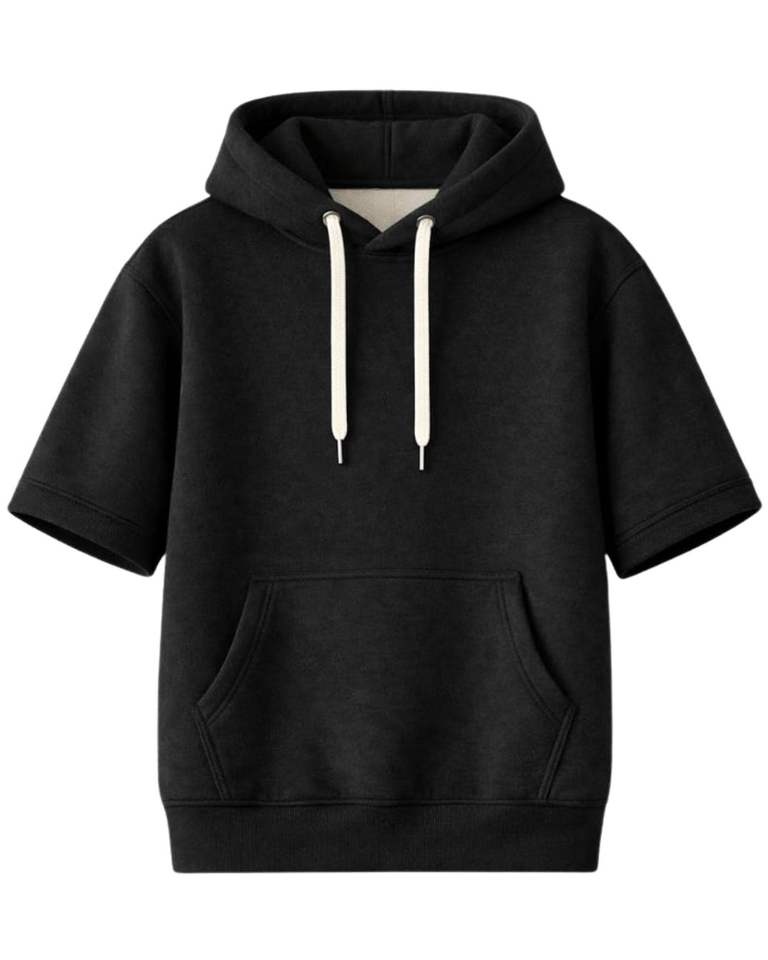 Customized Men Black Short Sleeve Hoodie Pullover Cotton Fleece Casual Streetwear Kangaroo Pocket Lightweight Summer Sweatshirt