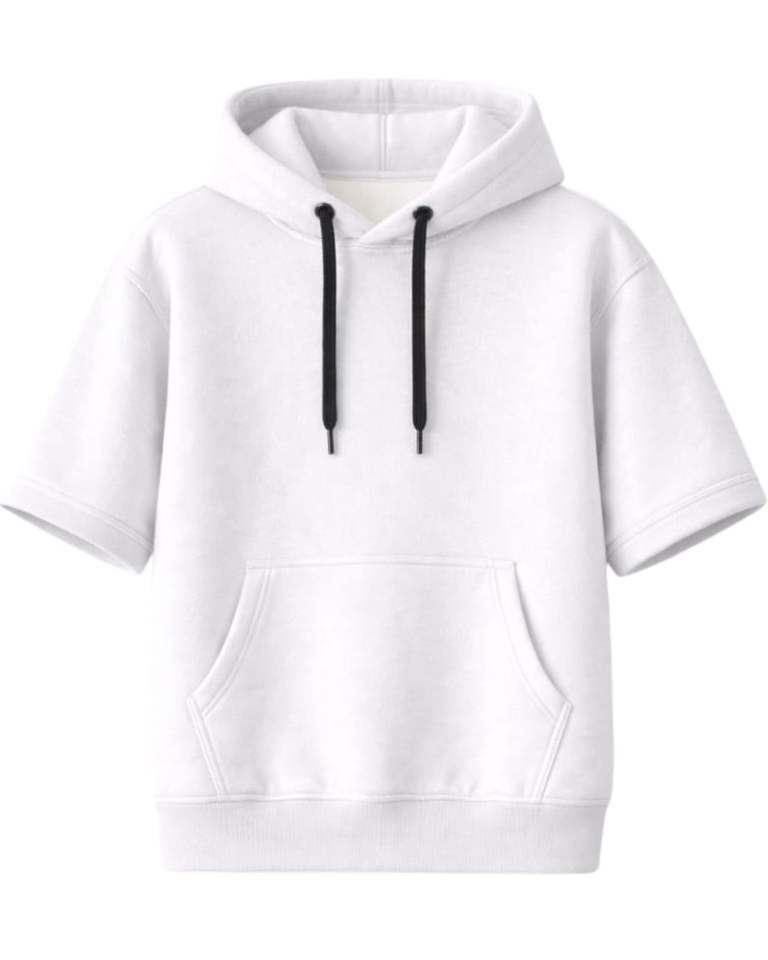 Customized Men White Short Sleeve Hoodie Pullover Cotton Fleece Casual Streetwear Kangaroo Pocket Lightweight Summer Sweatshirt