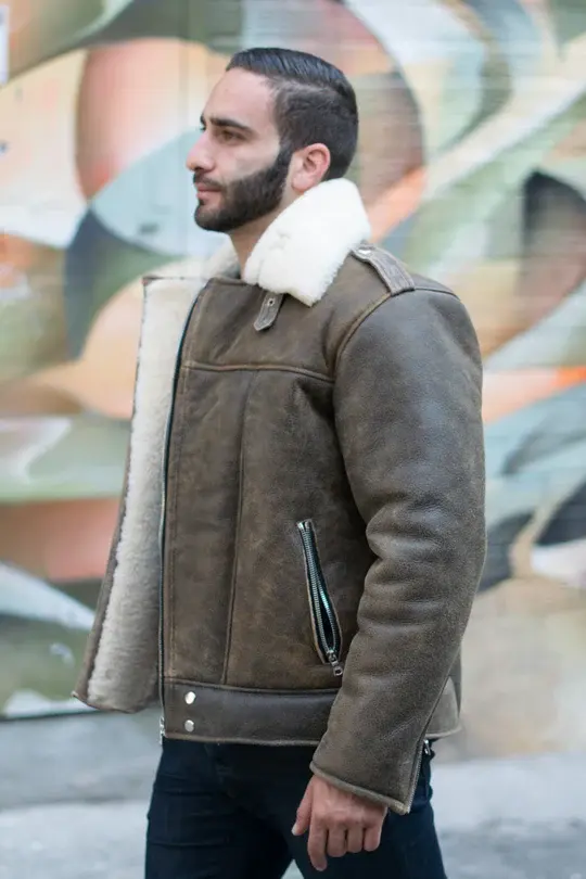 Customized Men's Vintage Distressed Sheep Skin Biker Bomber Jacket Formal Style Shearling Leather Jacket with Stand Collar