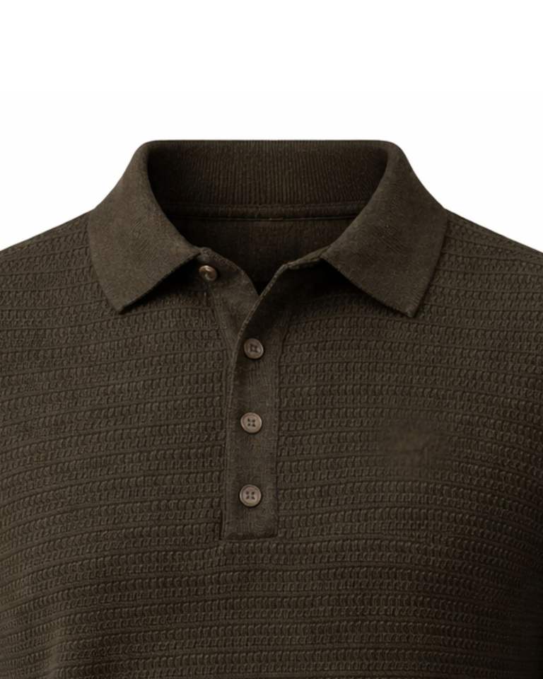 Customized Mens Fine Textured Knit Polo Sweater Long Sleeve Button Neck Casual Winter Pullover Top In Dark Olive Brown