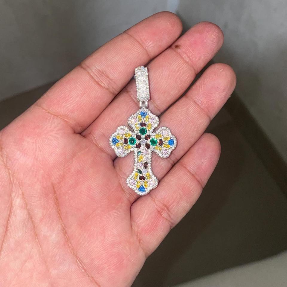 Customized Multicolor Stone Men's Hip Hop Style Cross Fine Jewelry VVS Moissanite Diamond 14k White Gold Fine Pendants & Charms