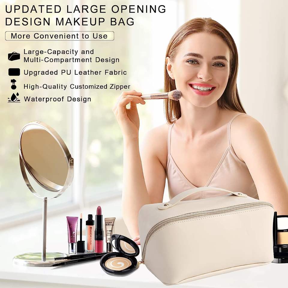Customized Organizer Beauty Pouch Pu Leather Open Flat Cosmetic Pillow Makeup Storage Travel Toiletry Bag With Gold Zipper
