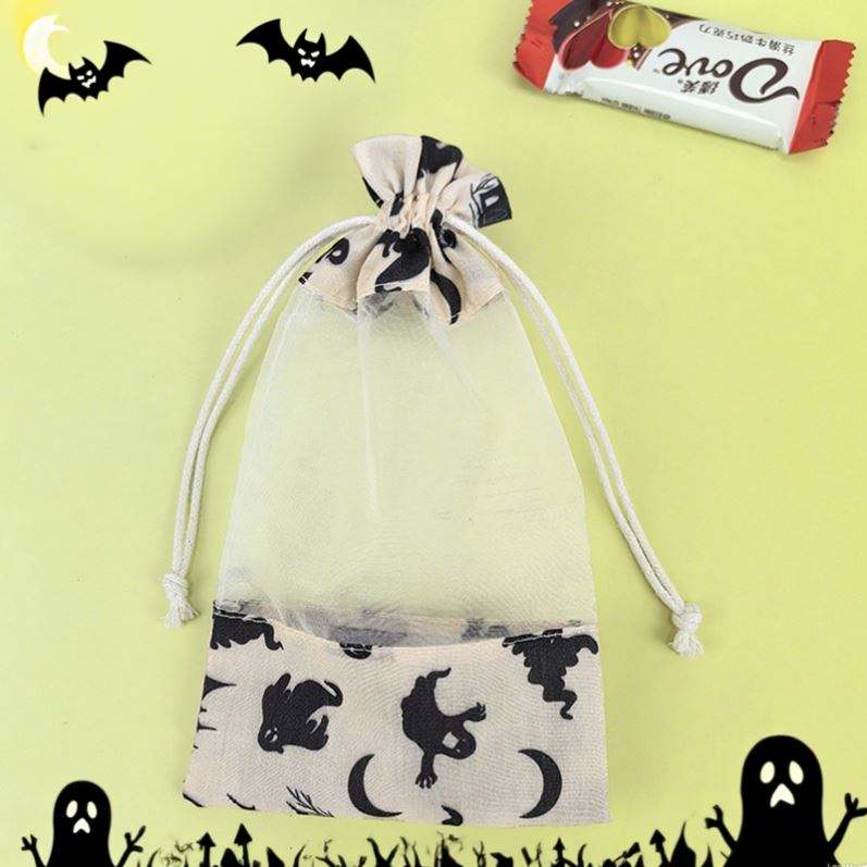 Customized Recyclable Organic Cotton Organza Pouch Jewelry Gift Packaging Halloween Drawstring Embroidery Print Candy Bags