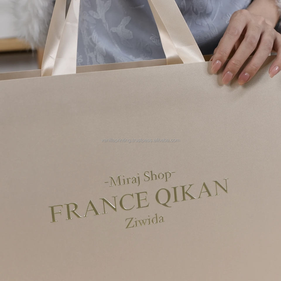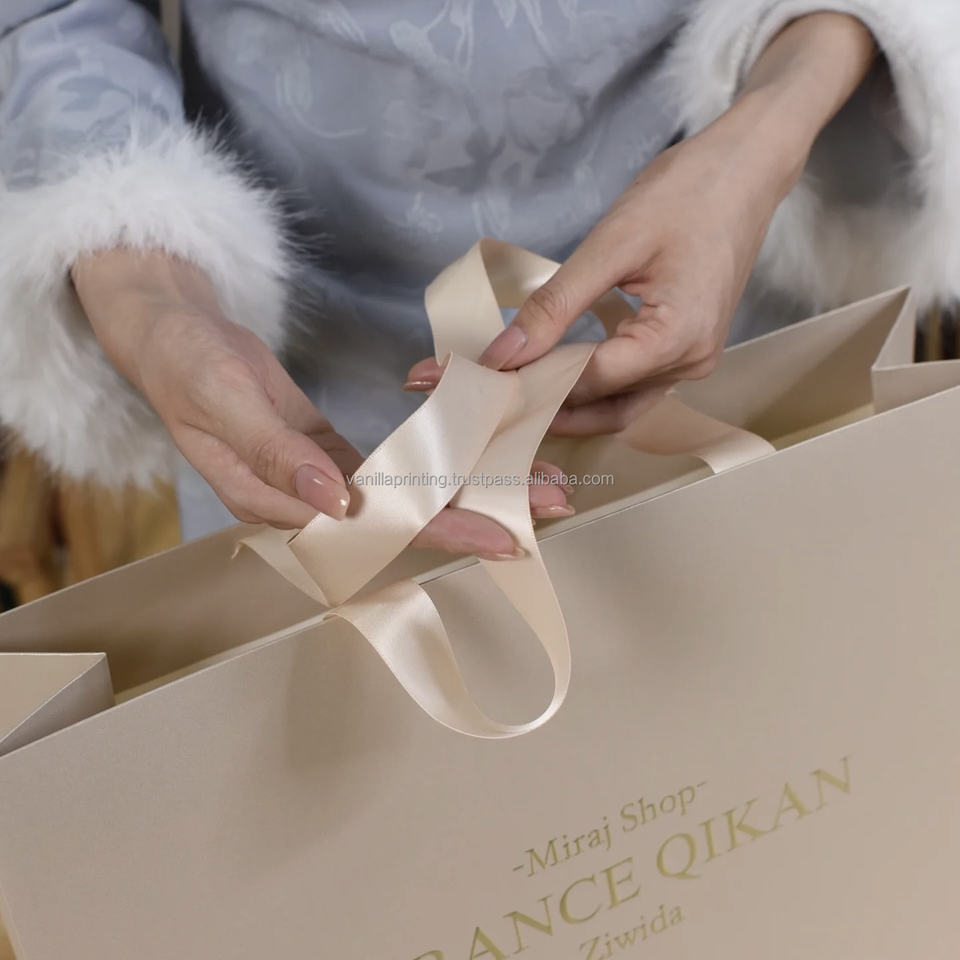 Customized Reusable Luxury Craft Paper Gift Bags with Embossing & Ribbon Handles for Clothing Perfume Shopping Promotion