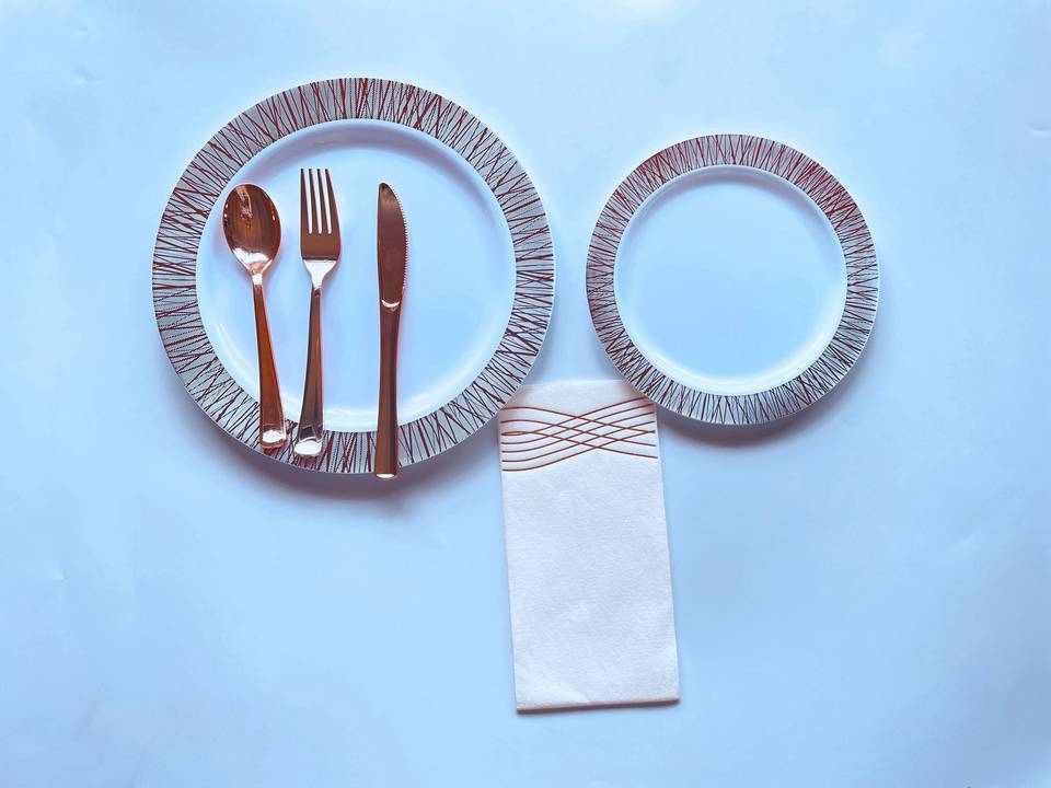 Customized Eco-Friendly BPA-Free Rose Gold Disposable Plastic Dinnerware Sets 100 Piece Minimum Includes Dish Spoon Fork-Free