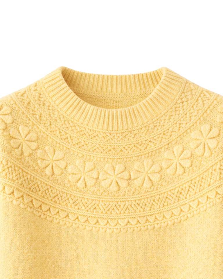 Customized Soft Yellow Jacquard Knit Sweater Floral Textured Crew Neck Long Sleeve Winter Pullover For Women Custom Wholesale