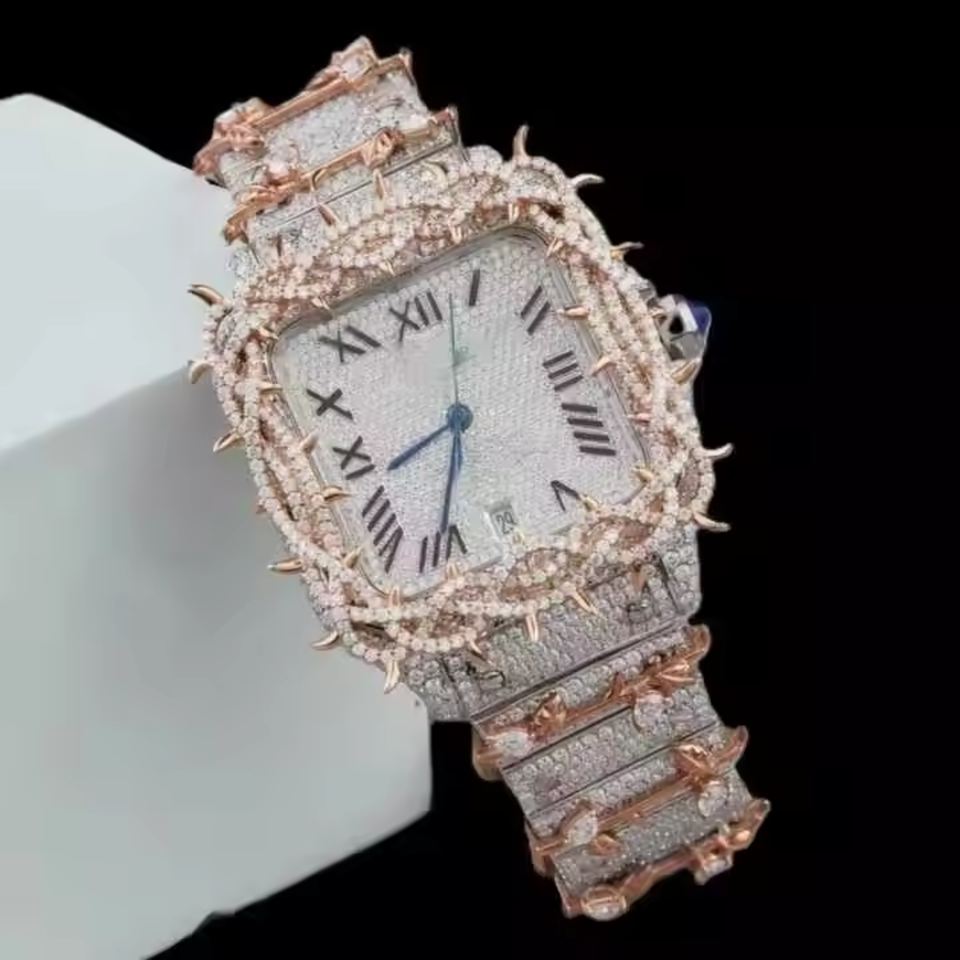 Customized Sport Fashion Automatic Rose Gold Moissanite Diamond Hip Hop Watch Elegant Luxury Stainless Steel Band Fully Quartz