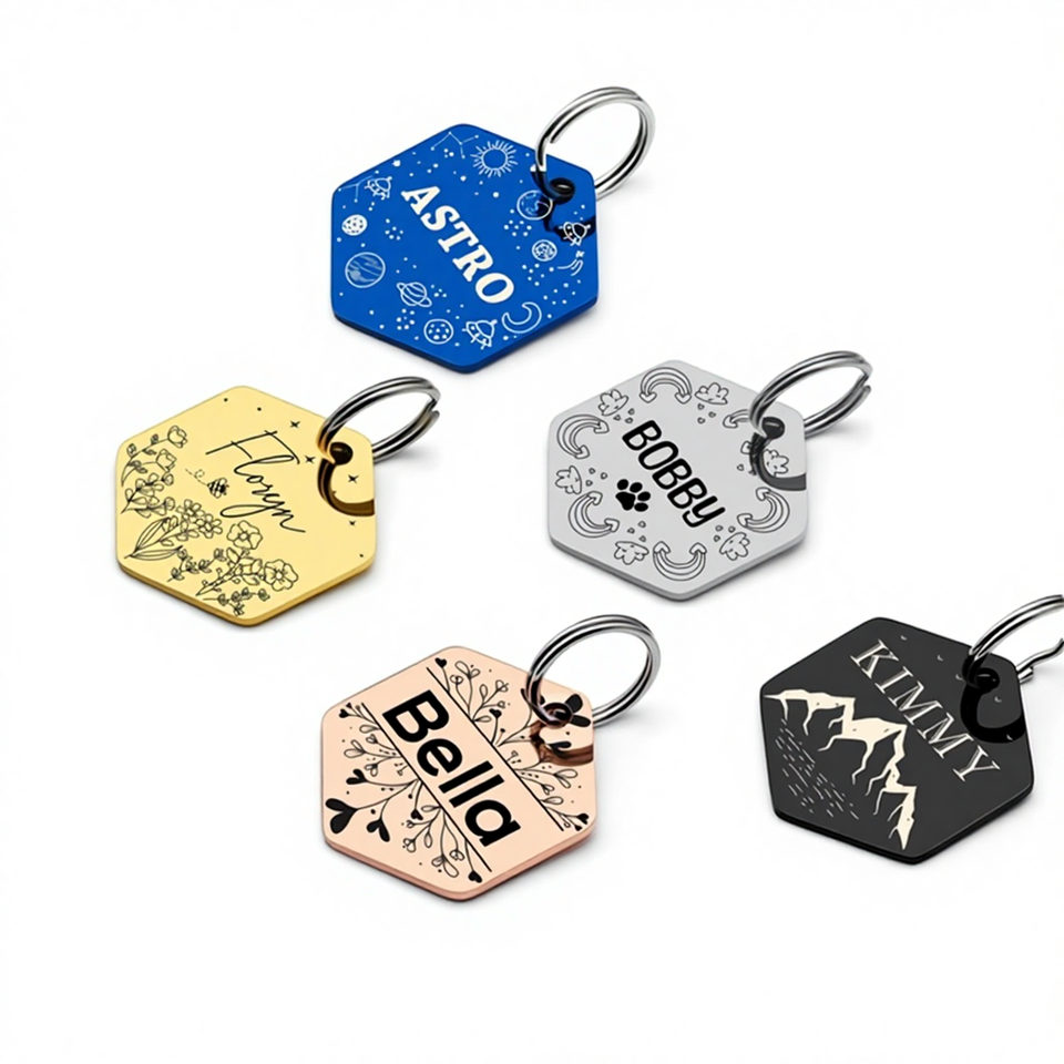 Customized Cow Leather Elegant Pet ID Tag Hexagon Personalized with Your Pet's Name Contact Front Back Engraving for Dogs & Cats