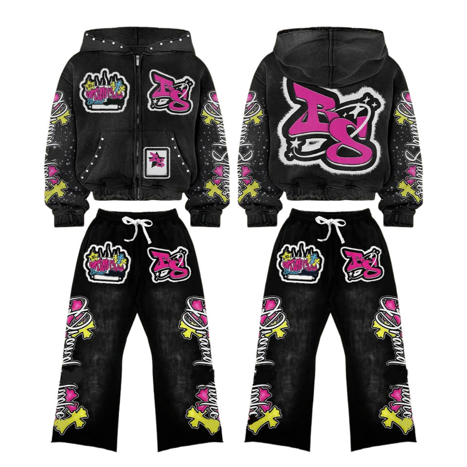 Customized Streetwear Baggy Hoodie and Stacked Pants Set Acid Wash Tracksuits Boys DTG Printed Cropped Flared Sweatsuits