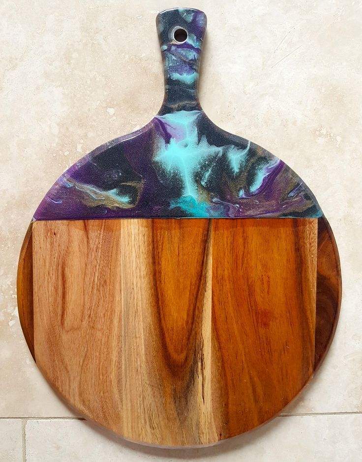 Customized Stylish Round Shape Acacia Wood Resin Cutting Board and Chopping Board with Handle for Kitchen Usage